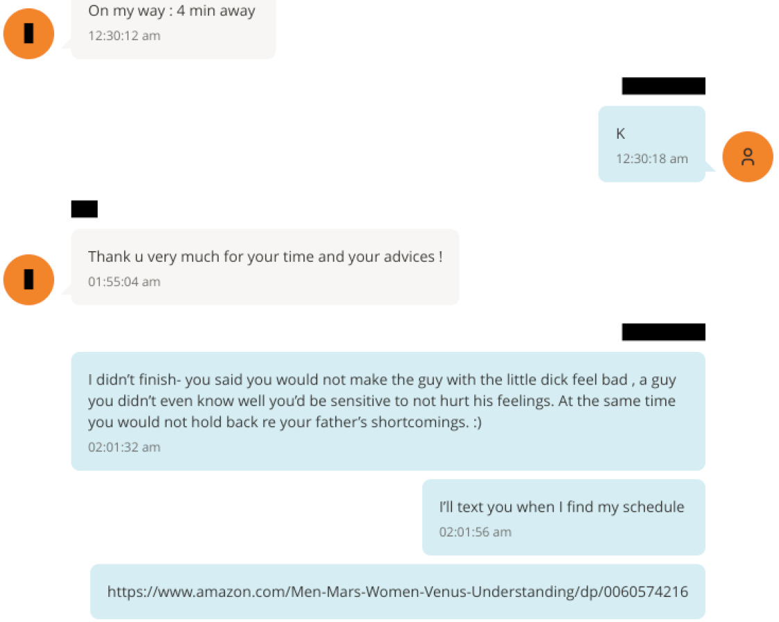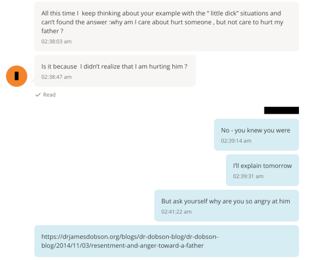 Page 4: The woman texts back: “All this time I keep thinking about your example with the ‘ little dick’ situations…” The woman says she cannot understand herself. Why does she treat her father differently than she does other men she’s encountered? She writes, “:why am I care about hurt someone , but not care to hurt my father ? Is it because I didn’t realize that I am hurting him ?” Jeffrey texts back confidently, no, you meant to hurt your dad, of course, and he says, “I’ll explain tomorrow.” They have plans to meet again. He continues: “But ask yourself why are you so angry at him”.