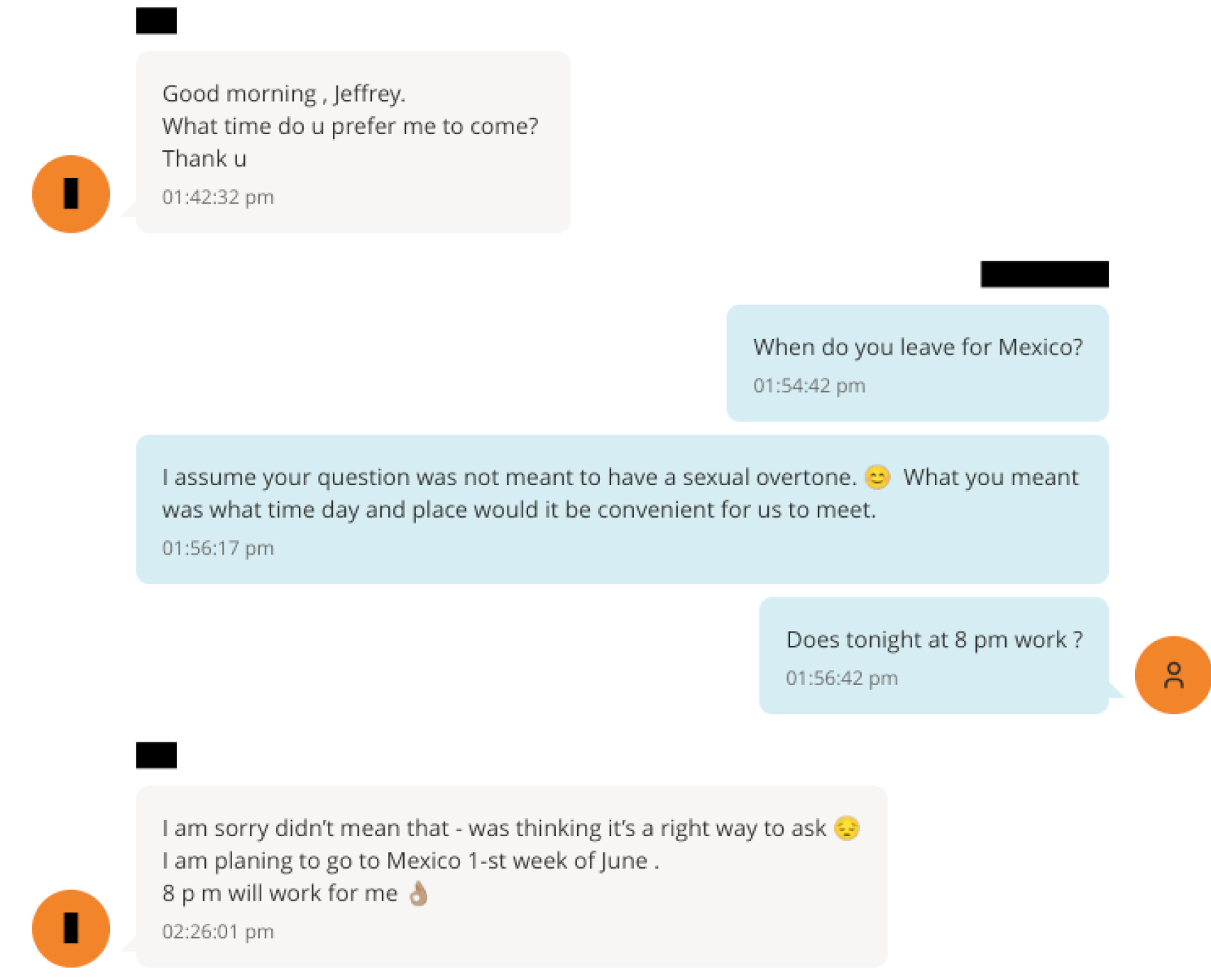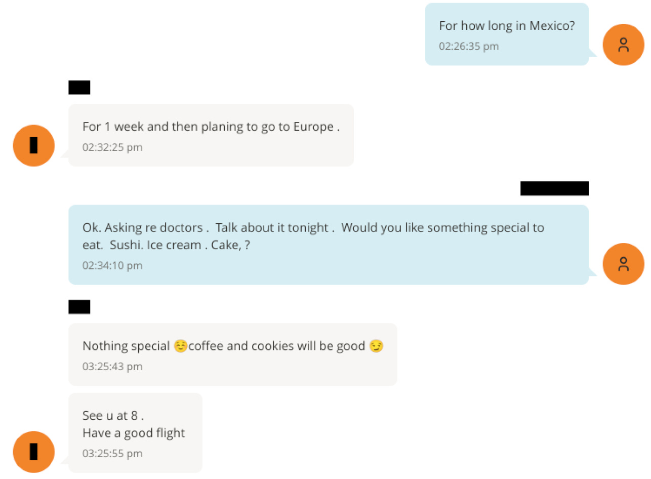 Pages 1-3: The woman makes plans to meet with Jeffrey in Mexico. Jeffrey makes a lude joke that makes the woman feel she has mistranslated her question (she seems not to be a native English speaker), though she hasn’t. It’s just a dirty old man thinking dirty about ordinary words (She says, “What time do u prefer me to come?” 🙄) They discuss their plans and Jeffrey asks about her itinerary “re doctors” (He’s bringing her to a doctor in Mexico?? Why???). Then they evidently have been together and parted, and the texts start up again. The woman sends a text to thank Jeffrey for “your time and your advices !”