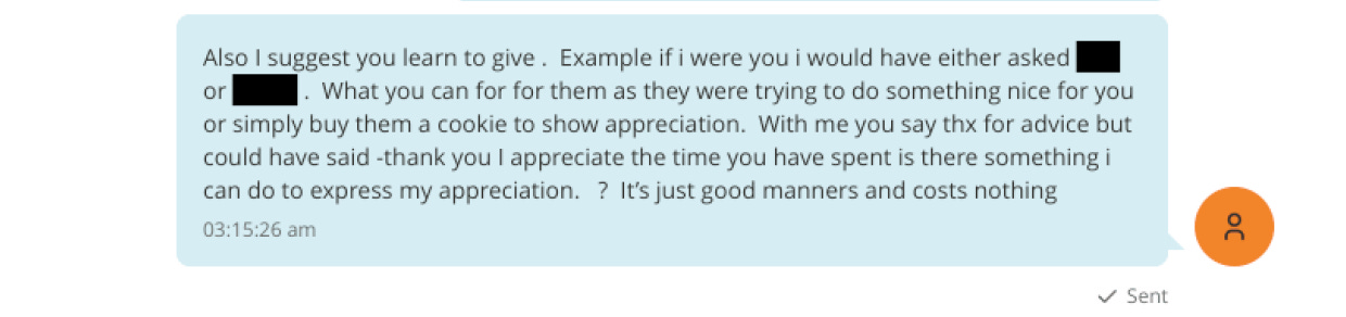 Page 5: Jeffrey tells this woman, “Also I suggest you learn to give.” He says that she should seek to be more accommodating and grateful to those who have shown her kindness. “Buy them a cookie to show appreciation,” he suggests. Or, then again, you can ask a solicitous question to discover what your friend wants: “With me you say thx for advice,” says Jeffrey, “but could have said - thank you I appreciate the time you have spent is there something I do to express my appreciation. ? It’s just good manners and costs nothing”.